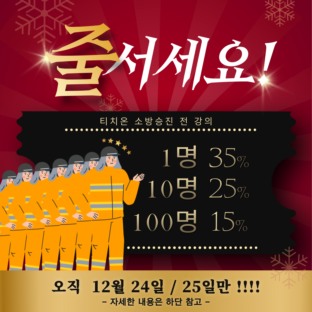 티치온 소방승진 강의25% 할인쿠폰 (10명)[ 쿠폰 발급 ]2022.12.25. (00시 00분) ~ 2022.12.25. (23시 59분)25일 하루만 발급 !!!