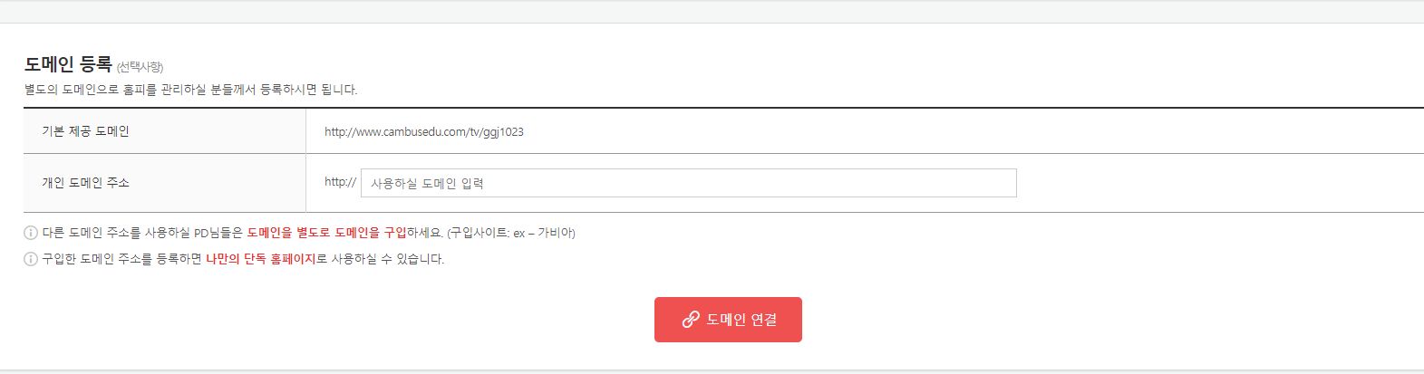 홈피를 생성하면 기본적으로 www.cambusedu.com/tv/(회원ID) 로 제공됩니다.