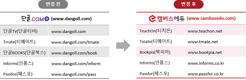 기존 도메인으로 접속 시 자동으로 신규 도메인으로 연결되며, 캠버스에듀 내 모든 사이트는 기존과 동일하게 이용하실 수 있습니다. 앞으로도 새로운 브랜드를 고객님들에게 인식 시킬 수 있도록 더 나은 서비스로 노력할 예정입니다. 온라인 교육의 패러다임을 바꿀 수 있는 온라인 교육 플랫폼의 중심이 되겠습니다. 감사합니다. |