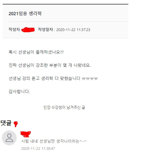 2021학년도 중등학교체육교사 임용후보자 선정경쟁시험 수험생분들~~인사가 늦었습니다. 수고가 많으셨습니다. 아울러 저와 함께 공부하신 분들께 좋은 결과를 있으시길 기원합니다. 앞으로도 겸손하게 여러분들께 도움이 되는 태선생이 되겠습니다. 감사합니다.